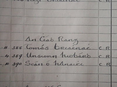Here are some more examples of what's in the roll books - but this time in Irish. The books went from English to Irish after the free state was established in 1922. For whatever reason, the books remained written in English until 1926.